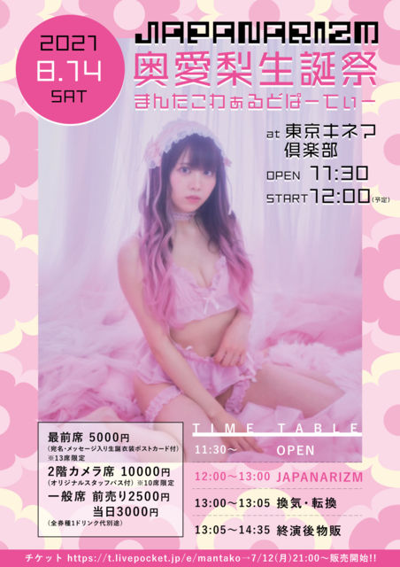 ¡Ö±ü°¦ÍüÀ¸ÃÂº× ¤Þ¤ó¤¿¤³¤ï¤¡¤ë¤É¤Ñ¡¼¤Æ¤£¡¼¡× ¢£Æü»þ 8/14(ÅÚ) ¢£²ñ¾ì Åìµþ¥¥Í¥Þ¶æ³ÚÉô ¢£»þ´Ö OP11:30/ST12:00 ¢£ÎÁ¶â ºÇÁ°ÀÊ 5000±ß(ÆÃŵÉÕ) ¢¨13Àʸ ¡¡¡¡¡¡¡¡2³¬¥«¥á¥éÀÊ 10000±ß(ÆÃŵÉÕ) ¢¨10Àʸ ¡¡¡¡¡¡¡¡°ìÈÌÀÊ Á°Çä2500±ß ¢£¥Á¥±¥Ã¥È https://t.livepocket.jp/e/mantako ¢ª7/12(·î)21:00¡Á