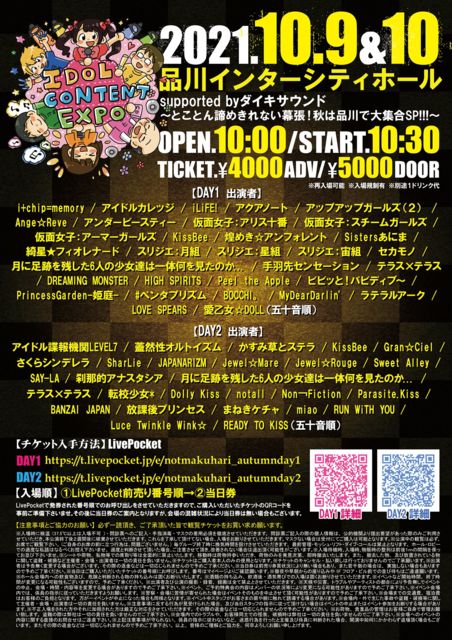 ¡ØIDOL CONTENT EXPO supported by¥À¥¤¥¥µ¥¦¥ó¥É¡Ù ¢£ÆüÄø¡¡10/10(Æü) ¢£»þ´Ö¡¡OPEN10:00 / START10:30 ¢£²ñ¾ì¡¡ÉÊÀ¥ó¥¿¡¼¥·¥Æ¥£¥Û¡¼¥ë ¢£ÃÍÃÊ¡¡Á°Çä4000±ß/ÅöÆü5000±ß¢¨ÊÌÅÓ1D ¢£¥Á¥±¥Ã¥È¡¡https://t.livepocket.jp/e/notmakuhari_autumnday2 Æþ¾ìÆÃŵ¡§¥¹¥Ý¡¼¥Ä¤Î½©¥é¥ó¥Á¥§¥+¥È¡¼¥¯Éռ̥á·ô