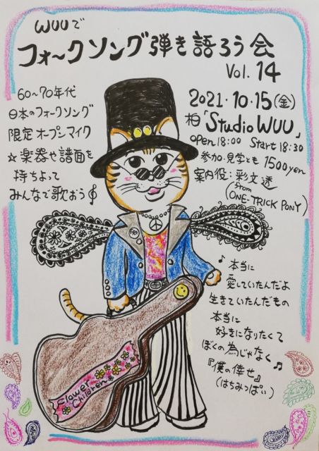 14²óÌܤΡ֥ե©¡¼¥¯¥½¥ó¥°ÃƤ¸ì¤í¤¦²ñ¡×¤¬³«ºÅ¤µ¤ì¤Þ¤¹¡£ ²ò½ü¤¬¤¢¤Ã¤Æ¤â´¶À÷¾ÉÂкö¤Ï¤·¤Ã¤«¤ê¹Ô¤Ã¤Æ¤ª¤ê¤Þ¤¹¤Î¤Ç¡¢ ¤ß¤Ê¤µ¤Þ¤è¤í¤·¤¯¤ª´ê¤¤¤¤¤¿¤·¤Þ¤¹¡ª ¡ú2021.10.15¡Ê¶â¡Ë¡¡Çð¡ÖStudio WUU¡×¡ú ¡¡¡¡¡¡¡¡¡¡¡¡¡¡¡¡¡¡¡¡¡¡¡¡https://www.wuu.co.jp/index.html ¡¡¡ØWUU¤Ç¥Õ¥©¡¼¥¯¥½¥ó¥°ÃƤ¸ì¤í¤¦²ñ¡Ù¡¡vol.14 ¡¡¡¡¡¡60¡Á70ǯÂå¥Õ¥©¡¼¥¯¸ÂÄê¡¡ ¡¡¡¡¡¡³Ú´ï¤äÉèÌ̤ò»ý¤Á´ó¤Ã¤Æ¤ß¤ó¤Ê¤Ç²Î¤ª¤¦¡ª ¡¡¡Ê1960ǯ¤«¤é1979ǯ¤Þ¤Ç¤ÎÆüËܤΥե©¡¼¥¯¥½¥ó¥°¸ÂÄꡪ¡Ë ¡¡¡¡°ÆÆâÌò¡§ºÌʸ Æ©(from ONE-TRICK PONY) ¡¡¡¡Open 18:00¡¡¡¿¡¡Start 18:30 ¡¡