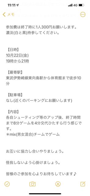 10/22(¶â)17:00¤«¤é²ÖÅç¸ø±àÂΰé´Û¤Ç¥Ð¥¹¥±¤·¤Þ¤¹¤Î¤Ç¡¢¥²¥¹¥È»²²Ã¼ÔÊ罸¤·¤Þ¤¹¡£»²²Ã»ñ³Ê¤Ï2¡Á40ºÐ¤Þ¤Ç¤ÎÃ˽÷¡¢¹â¹»¥ì¥Ù¥ë·Ð¸³¼Ô°Ê¾å¡¢½÷À¥×¥ì¡¼¥ä¡¼Áê¼ê¤Ç¤â¿¿·õ¤«¤ÄÇÛθ¤¢¤ë¥²¡¼¥à¤Ç¤¤ëÃæµé¼Ô°Ê¾å´¿·Þ¡¢´ÀÅù¥¨¥Á¥±¥Ã¥È¡¢¥Þ¥Ê¡¼½å¼é¡¢ÇòÇ»¥·¥ã¥Ä¤«¥ê¥Ð¡¼¥·¥Ö¥ë»ý»²¡¢»²²ÃÈñ500±ßÁ°¸å(»ÈÍÑÎÁ³ä¤ê´ª)¡¢»öÁ°Ï¢Íí¤¤¤¿¤À¤±¤ëÊý¤Ç¤ª´ê¤¤¤·¤Þ¤¹¡£»²²Ã¥á¥ó¥Ð¡¼¤Ï2¡Á40ÂåÃ˽÷·Ð¸³¼Ô¤Ç¤¹¡£ÂÎÄ´ÉÔÎɰʳ°¤Î¥É¥¿¥¥ã¥ó¤Ï¤´±óθ¤¯¤À¤µ¤¤¡£¤Ê¤ª¿Í¿ô½¸¤Þ¤ê¤Þ¤·¤¿¤éÄù¤áÀÚ¤ê¤Þ¤¹¡£·Ñ³»²²Ã¤¤¤¿¤À¤±¤½¤¦¤Ê¾ì¹ç¤Ï¥°¥ë¡¼¥×LINE¤Ë²ÃÆþ¤¤¤¿¤À¤¡¢º£¸å¤Î¥¹¥±¥¸¥å¡¼¥ëÅù¤´°Æ