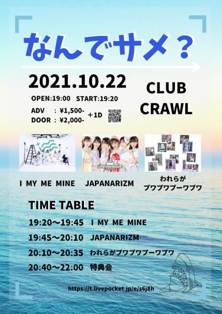 ¡Ö¤Ê¤ó¤Ç¥µ¥á¡©¡× ¢£Æü»þ¡¡2021ǯ10·î22Æü (¶â) ¢£²ñ¾ì¡¡½ÂëCLUB CRAWL ¢£»þ´Ö¡¡OPEN19:00/ START19:20 ¢£½Ð±é¼Ô¡¡I MY ME MINE / JAPANARIZM / ¤ï¤ì¤é¤¬¥×¥ï¥×¥ï¥×¡¼¥ï¥×¥ï ¢£ÎÁ¶â¡¡Á°Çä\1,500 / ÅöÆü\2,000 ¢£¥Á¥±¥Ã¥È¡¡https://t.livepocket.jp/e/s6j8h