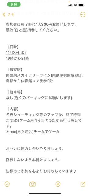 現在9名参加予定! 3〜4名程募集となります! ・昭島市立拝島中学校 ・19:00~21:00 ・車駐車OK ・濃淡ウェア持参 ・参加費100円 ・経験者のみ よろしくお願いします!