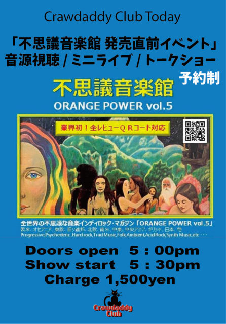11/3 本日は「不思議音楽館 発売直前イベント」 OPEN 17:00 START 17:30 CHARGE 1500円 音源視聴 / ミニライブ / トークショー 予約制イベントとなります。 ライブ配信も予定しています。 https://m.youtube.com/c/CrawdaddyClub よろしくお願いいたします!