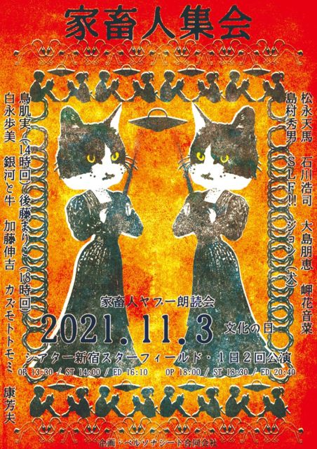 家畜人集会 - 家畜人ヤプー朗読会 – ●出演 松永天馬 石川浩司 鳥肌実(14時回のみ) 後藤まりこ(18時回のみ) 大島朋恵 岬花音菜 島村秀男 SLF!! ジョン(犬) ●開会宣言 白永歩美(月蝕歌劇団) ●前説 銀河と牛 ●アートワーク 加藤伸吉 カズモトトモミ ●「家畜人ヤプー」全権代理人 康芳夫 https://portable-rock.com/?p=885