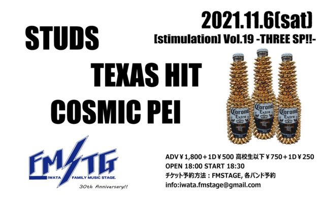 ¡ÚSTUDSÈØÅĹԤ¤Þ¤¹¡Û 11·î6Æü(ÅÚ) ÀŲ¬ ÈØÅÄFM STAGE "stimuation" Vol.19 [THREE SP] STUDS TEXAS HIT COSMIC PEI ¢¨STUDS¤Ï20»þ½Ð±éͽÄê ¢¨»ý¤Á»þ´Ö40ʬ °ìÈÌADV¡ï1,800¡Ü1D¡ï500 ¹â¹»À¸°Ê²¼¡ï750¡Ü1D¡ï250 OPEN 18:00 START 18:30 ¥Á¥±¥Ã¥ÈͽÌó¤Ï¤³¤Á¤é¤Ë»²²Ã¤·¤Æ¤¤¤¿¤À¤±¤ì¤Ðmixi¥Í¡¼¥à¤Ë¤Æ¼èÃÖ¤¤·¤Þ¤¹¡ª ¤Þ¤¿¤Ïwebsite¡¢³ÆSNS¥á¥ó¥Ð¡¼¥¢¥«¥¦¥ó¥È¤«¤é¤Ç¤âok¤Ç¤¹¡ª ¤è¤í¤·¤¯¤ª´ê¤¤¤·¤Þ¤¹¡ª