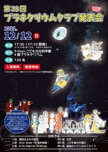 去年は感染症対策で発表会も中止になりましたが、今年は今の所開催の予定です。 緊急事態宣言等休館が多く、活動日程が減った分、例年よりも日程が後ろ倒しになりました。 プラネタリウムクラブ発表会 5-Daysこども文化科学館プラネタリウム http://www.pyonta.city.hiroshima.jp/event/detail/id/4529.html 開催日 2021年12月12日(日) 時間 17:30〜19:00(予定) ※17:10開場 ※17:00より4階でお待ちいただけます 場所 4階 プラネタリウム 料金 無料 その他 ・定員120名 ・途中入退場はで