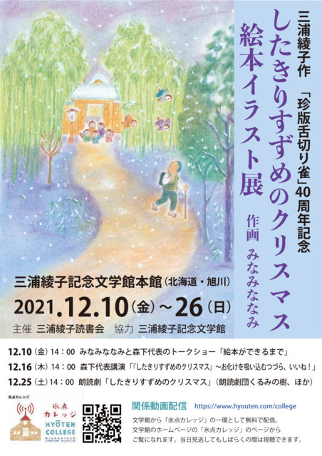 【三浦綾子記念文学館のイベントのお知らせ】 三浦綾子読書会会員のみなみななみさんの「したきりすずめのクリスマス」絵本イラスト展が12月10日(金)から12月26日(日)旭川の三浦綾子記念文学館で開催されます。 そのお知らせに上がりました。 三浦綾子原作「珍版舌切り雀」40周年記念 したきりすずめのクリスマス 絵本イラスト展 作画 みなみななみ ―概要― 三浦綾子記念文学館本館(北海道・旭川) 期 間 2021年12月10日(金)〜 26(日) 会 場 三浦綾子記念文学館本館1階第3展示室及び本館1階喫茶スペース 休館日:毎