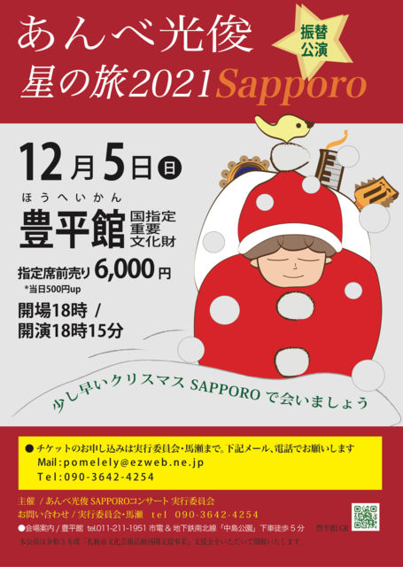 あんべさんの札幌コンサートが以下の要領で開催されます。 コロナも落ち着いてきたので、出かけましょう。 ======================== 12月5日(日) 開場18:00 / 開演18:15 会場 / 豊平館 https://www.s-hoheikan.jp/ 全席指定前売り6,000円 当日券6,500円 主催 / あんべ光俊SAPPOROコンサート実行委員会 お問い合わせ / 実行委員会(馬瀬) tel.090-3642-4254 チケットのお申し込みはメールまたは電話で mail : pomelely@ezweb.ne.jp tel. : 090-3642-4254 コンサート実委・馬瀬まで チケットは当日会場にて代