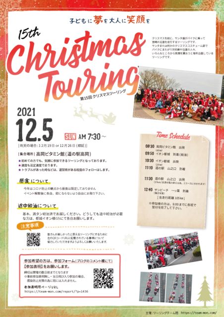 2021年クリスマスツーリングも去年と同じく中止も検討していたのですが、 宮崎県内の新型コロナウィルスの感染状況が減少傾向であり、ワクチン接種の状況もよいことから現時点で開催を予定することとなりました。 幹事はヨコですがmixiの募集は、わたくし鷲田が管理します。どうぞよろしくお願いします。 ※今回、新規感染者が減少傾向とはいえ、不要な感染リスクを上げる可能性のある昼食を省いております※ ※走行時は接触はありませんが、休憩場所では参加者同士の距離の確保を徹底して下さい※ 子供に夢を大人に笑顔を届けられるイベント