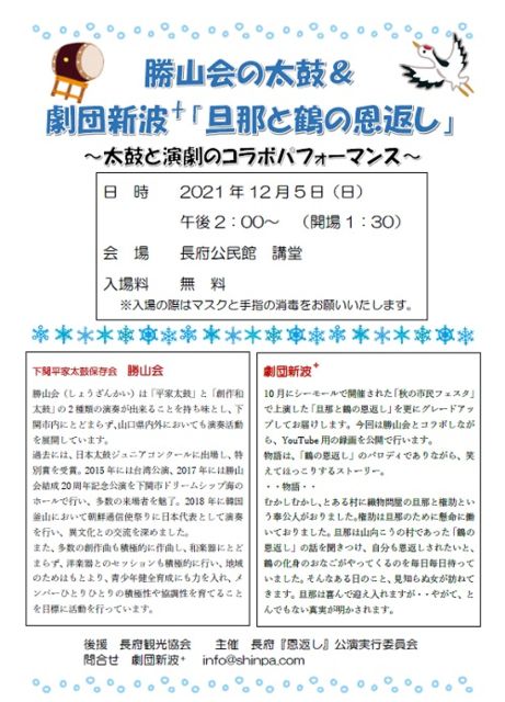 12月5日の日曜日 14時から #長府公民館 で #平家太鼓保存会 の #勝山会 と #コラボ で 10月に #シーモール で #上演 した「#旦那 と #鶴の恩返し」を グレードアップして再上演します。 #入場無料 です。 お時間がありましたら、ぜひお運びください