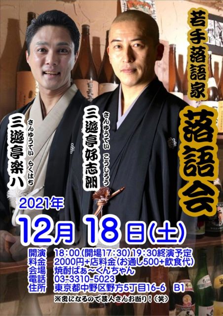 以前くんちゃんで開催されていたお笑いライブにも度々出演してくれていた西村くんですが、2016年に三遊亭好楽に弟子入りし、三遊亭西村として落語家に転身。 2020年6月に二つ目に昇進し、三遊亭好志朗に改名。 昨年9月にはくんちゃんにて、『三遊亭好志朗勉強会』を開催。 今年4月には、兄弟子にあたる三遊亭楽八さんとの二人会を実施し、今回はその第5回目となります。 そして、好志朗くんは、今年の『NHK新人落語大賞』決勝に進出! 11/23にはその結果が明らかに コロナ禍で鬱積したストレスを落語で吹き飛ばしてみてはいかがー。