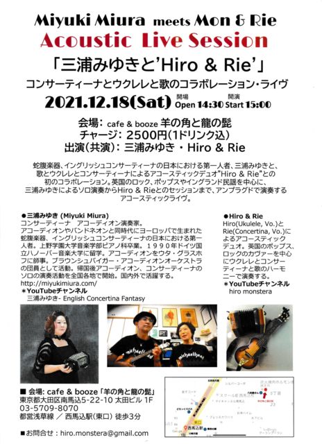 ライブのお知らせをいたします Miyuki Miura meets Mon & Rie Acoustic Live Session 出演「三浦みゆきとHiro & Rie'」 コンサーティーナとウクレレと歌のコラボレーション・ライヴ 2021.12.18(Sat) open 14:30 会場: cafe & booze 羊の角と龍の髭 大田区 西馬込駅徒歩5分 2500円(1ドリンク込)