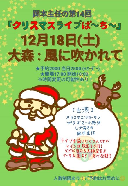 ●概要 12月18日(土) 大森:風に吹かれて http://oomorikazefuka.weebly.com/ 第14回 クリスマスライブぱ〜ち〜 予約2000 当日2500 (+オーダー) 17:00/18:00 出演:クリスマスツリーマン、プラズマー小野沢、しづあさの、さとうGO!、岡本主任 ●特色 ライブも盛りだくさんですが、メインは現金1万円!などが当たる大抽選会♪ ケーキも出ます!食べ放題!? 人数制限あり!ご予約はお早めに! ●タイムスケジュール 18:00 挨拶 18:05 クリスマスツリーマン 18:25 プラズマー小野沢 19:00 しづあさの 19:40 さとう