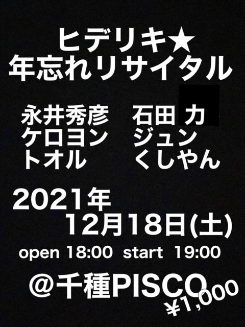 12月18日(土) 愛知県 名古屋 千種 PISCO https://goo.gl/E4Mjrk 「ヒデリキ☆年忘れリサイタル」 出演:永井秀彦/石田力/ケロヨン/ジュン/トオル/くしやん open18:00 start19:00 チャージ1000円 +1DRINK