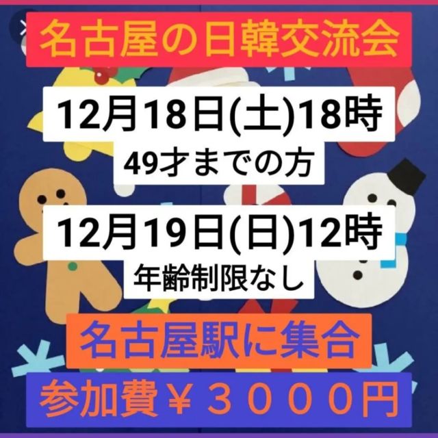 🇰🇷名古屋の日韓交流会🇰🇷 12月18日の土曜日の 18時に名古屋駅に集合 (49才までの方) 12月19日の日曜日の 12時に名古屋駅に集合 (年齢制限なし) ⛺開催場所⛺ 詳しい開催の場所は、 参加者だけに教えます。 名古屋駅から15分で 行ける場所でやります。 💰参加費💰 ¥3000円 🍚メニュー🍚 サムギョプサル チャミスル飲み放題 その他、いろいろ 韓国が大好きな方🌟 参加できる方は僕に メッセージください。 日韓名古屋のホームページ htt