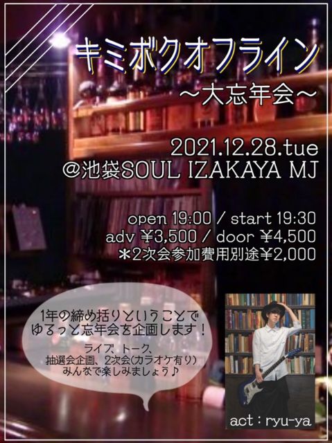 【Ryu-ya☆LIVE演奏会♪】 ●内容● 友人のミュージシャン「Ryu-ya」によるLIVEやります(・∀‐)ノ MJから参加の方は当日でも前日予約扱いの金額とさせていただきます(^O^)/♪ ~*~*~*~*~*~ [新型コロナ対策について] ☆マスク着用お願いいたします ☆手洗い・消毒・100%徹底 ☆お酒に使うマドラーは1杯ごとに取換えます ★体調がすぐれない方は参加自粛お願いいたします ~*~*~*~*~*~ Ryu-ya☆LIVE♪ ★