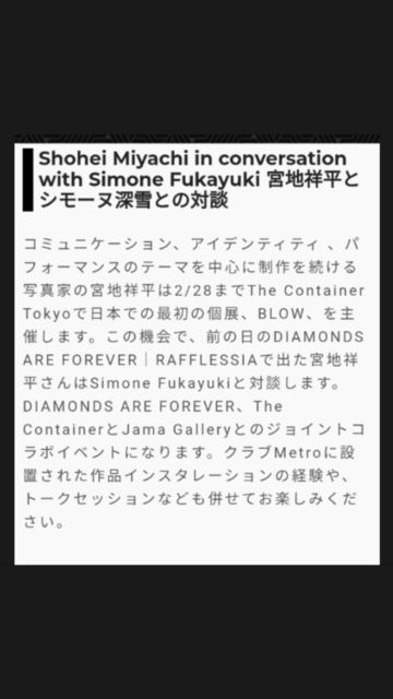 Shohei Miyachi in conversation with Simone Fukayuki 2022 01 29 sat 3:00〜6:00 talk 4:00〜 ¥600 inc.1drink @ METRO Instalation by Shohei Miyachi & Foster Mickly In Collaboration with Jama Gallery MiyachiShohei SimoneFukayuki Afreeda O Blart & Isabelle