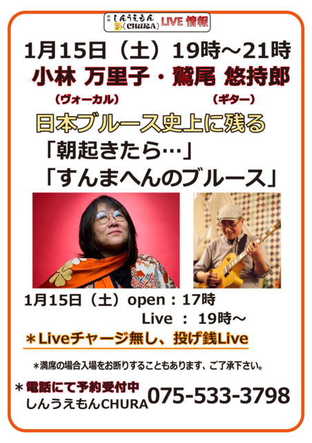 今年のライブの第1発目として 京都祇園の沖縄料理店「しんうえもん CHURA」さんでやらせていただきます。 初めてやらせていただくお店ですが、下ネタはOKと伺っており、 とりあえず下ネタ中心でお届けしようかと思っております。 「下ネタはありや言うても、そんな下ネタ望んでへんで」という お叱りの声がなければいいんですが…。 フライヤーですが、お店の方で作成してくださったものを掲載させていただきます。 キャッチコピーを送ってくださいとのことで 「日本のブルース史上に残る(割には知られていない) あの「朝起きたら…」や「