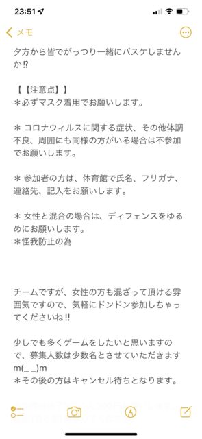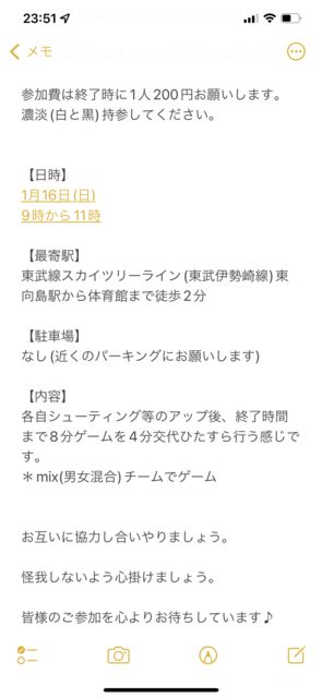 こんにちはナギと申します 次の日曜日に体育館が確保できたため、募集いたします。 基本的に皆で楽しむことを目的としておりますので、女性の方や初心者のかたも歓迎いたします。 経験者の方ももちろん募集いたします。 『詳細』 ・場所 大田区区民プラザ地下一階 (下丸子駅から徒歩一分) ・時間 9時から11時30分です。 ・費用 500円です 9時から9時半まで各自アップ 9時半から10時まで全体アップ 10時から終了時間まで試合となっております。 『注意事項』 ・12時には完全撤収でお願いします ・体