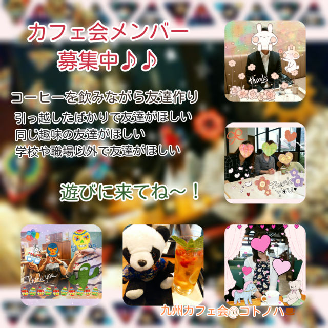〜福岡の友達作り@九州カフェ会〜 福岡の皆さん、こんばんは! 友達作りをしたい方のための交流会、 『博多deまったり友活カフェ会』を開催します♪ 寒い日が続いていますね。 あったかいカフェで美味しいドリンクをいただきながら、友達作りしませんか? まったり友活カフェ会とは・・・ おしゃれなカフェで おしゃれなドリンクを飲んだり 美味しいスィーツをいただきながら 色んな人に出会って 色んな価値観にふれながら友達作りをしよう! という会です!!(*≧▽≦*) 引っ越してきたばかりで 一緒に飲みに行った