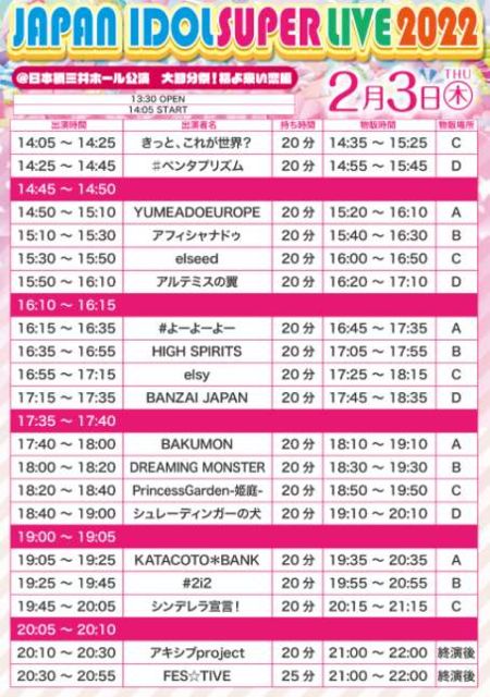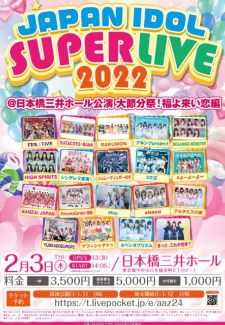 「JAPAN IDOL SUPER LIVE 2022」@日本橋三井ホール公演 大節分祭!福よ来い恋編 日程:02/03(木) 開場13:30 / 開演14:05 会場:日本橋三井ホール 料金:一般3,500円/前方優先5,000円/女性限定1,000円 (D別) チケット:https://t.livepocket.jp/e/aaz24 【タイムテーブル】 出番:20:30〜20:55 特典会:終演後21:00〜22:00
