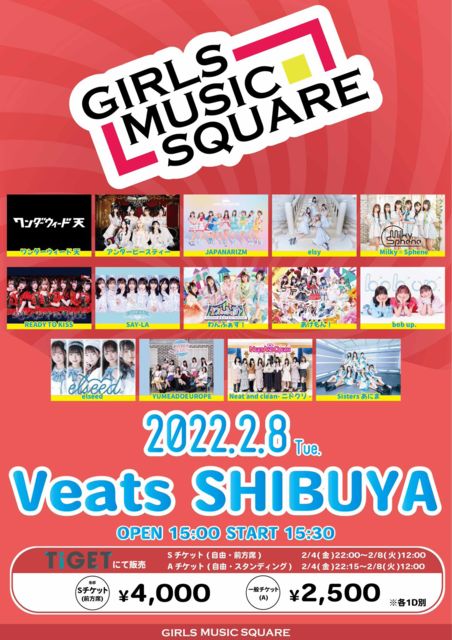 「GIRL MUSIC SQUARE」 ■日程 2/8(火) ■会場 SHIBUYA veats ■時間 OPEN15:00/START15:30 ■料金 前方\4000/一般\2500(1D別) ■チケット https://tiget.net/events/166845 →2/4(金)22:00~販売開始 入場特典:15秒動画券
