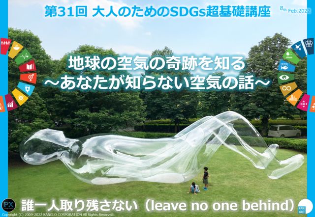 「地球の空気の奇跡を知る〜あなたが知らない空気の話」第31回大人のためのSDGs超基礎講座(2022年2月8日) チケット https://kanglo-sdgs0208.peatix.com/view https://www.facebook.com/events/649483216479225 --------------------------- 参考【ダイジェスト版動画】 「質の高い教育とは一体何か?本質に迫る」第30回Anv.大人のためのSDGs超基礎講座(2022年1月11日)【ダイジェスト版動画】 https://youtu.be/XP129td-nU0 SDGsにまつわる色々な話について❸/3〜それでもSDGsは世界を変えると信じる!どうすれば良いかその