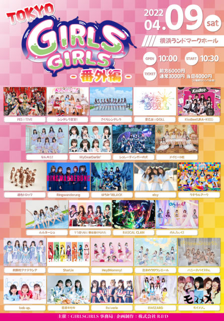 「TOKYO GIRLS GIRLS -番外編-」 日程:04/09(土) 開場10:00 / 開演10:30 会場:横浜ランドマークホール 料金:前方6,000円 / 通常3,000円 / 当日4,000円 (D別) チケット:https://t.livepocket.jp/e/tgg_bangai_0409 出演:FES☆TIVE , シンデレラ宣言! , さくらシンデレラ , 愛乙女☆DOLL , KissBee(URA-KiSS) , なんキニ! , MyDearDarlin’ , シュレーディンガーの犬 , メイビーME , 透色ドロップ , Ringwanderung , はちみつBLACK , elsy , ラテラルアーク , ルルネージュ , 1つ足りない賽は投げられた , RASCAL CLAN , のんふぃく! ,