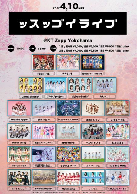 「 ッスッゴイライブ」 日程:04/10(日) 開場10:30 / 開演11:00 会場:Zepp Yokohama 料金: 1階席:前方9,000円 / 前売5,000円 / 当日6,000円(D別) 2階席:前方7,000円 / 前売3,500円 / 当日4,500円(D別) チケット:https://t.livepocket.jp/e/ssuggoi_zepp_0410 出演:FES☆TIVE , ナナランド , 煌めき☆アンフォレント , JamsCollection , アキシブproject , MyDearDarlin' , なんキニ! , Peel the Apple , 群青の世界 , シュレーディンガーの犬 , 透色ドロップ , メイビーME , Sweet Alley , 綺星☆フィオレナード , littlemore. ,