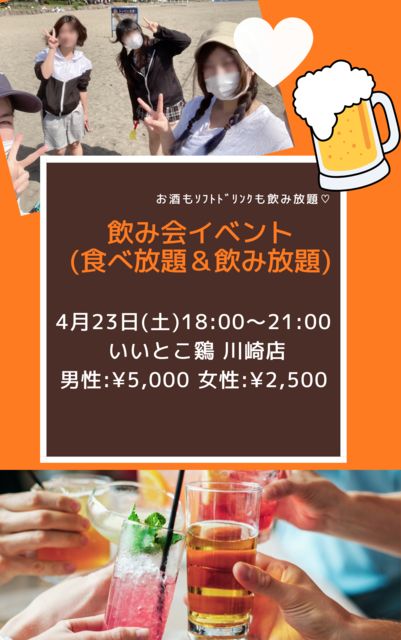 一緒に飲みませんか(*ˊ˘ˋ*)? お酒が大好きな方❣待ってます🥳🥳🥳 ✩ ⋆ ✩ ⋆ ✩ ⋆ ✩ ⋆ ✩ ⋆ ✩ ⋆ ✩ 4月23日(土)18:00〜21:00 飲み会イベント 〜地鶏料理26種3時間食べ飲み放題〜 ★いいとこ鷄 川崎店★ 男性5,000円 女性2,500円 ✩ ⋆ ✩ ⋆ ✩ ⋆ ✩ ⋆ ✩ ⋆ ✩ ͺ