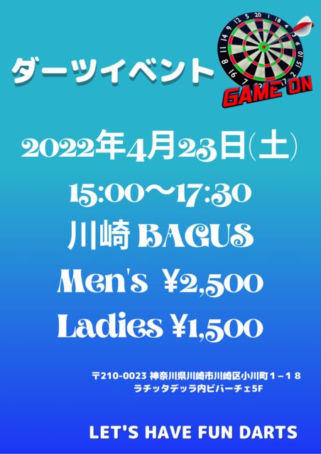 一緒に楽しんじゃいましょっ(*'∇'*)ワクワク 〜ダーツイベント〜 4月23日(土)15:00〜17:30 ★川崎BAGUS★ 参加費♡ワンドリンク付き★ 男性2,500円 女性1,500円 乱数表を基にゲームをやります 初心者も大歓迎です(*'∇'*) メッセージお待ちしております♪(*^^)o