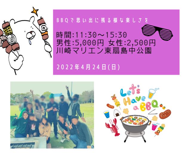 BBQイベント開催しますっ♪(*^^)o 是非、皆さんで楽しみましょう( 'ω' )و 4月24日(日)11:30〜15:30 〜BBQイベント〜 男性5,000円 女性2,500円 -川崎マリエン東扇島中公園かまど4- ★ソフトドリンク&アルコール有★ メッセージお待ちしております(*ˊ˘ˋ*)