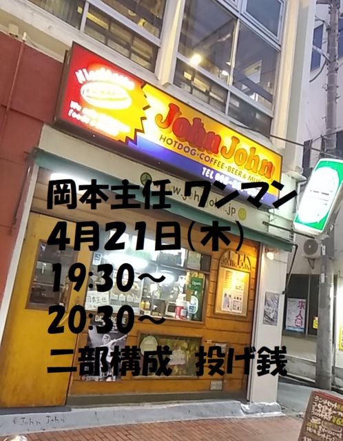 ●概要 4月21日(木) 伊勢佐木町:JohnJohn http://johnjohn.jp/ ワンマンライブ! 19:30〜と20:30〜の二部構成 ※お店は昼からやっています。早く来るとリハから見れます。 チャージ無料(投げ銭制)+オーダー ●特徴 超〜老舗のホットドッグ屋さんです。 安くて美味しいよ!(^〜^)モグモグ 実質、格安で岡本主任をタップリ聞けますよ♪ ●コロナ関係 現在こちらのお店は営業しておりません(^^;) よって、この日も開催できるか否かは、未定でございます。 開催の際も、正直狭めの店内でございます。気になる方はご来場、