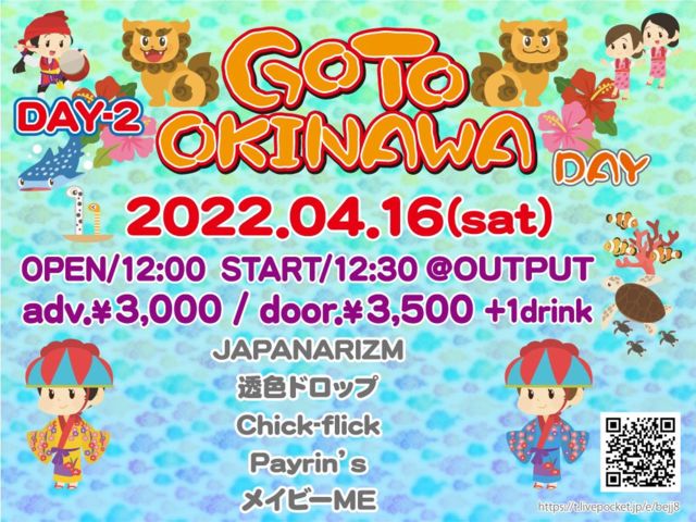 「GO TO OKINAWA DAY1」 ■日時 2022/4/15(金) ■会場 OUTPUT ■時間 OPEN18:45 / START19:15 ■料金 前売3000円 / 当日3500円 (各1D別) ■チケット https://t.livepocket.jp/e/r-15d