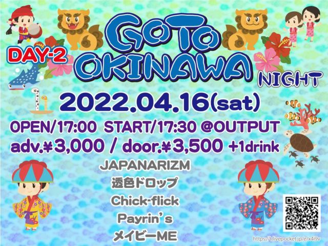 「GO TO OKINAWA NIGHT」DAY-2 ■日時 2022/4/16(土) ■会場 OUTPUT ■時間 OPEN17:00/ START17:30 ■料金 前売3000円 / 当日3500円 (各1D別) ■チケット https://t.livepocket.jp/e/x4i9v 本日19:30〜チケ発