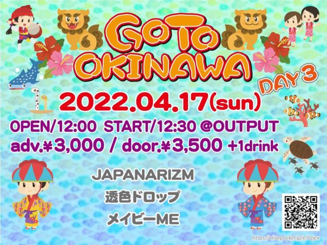 「GO TO OKINAWA DAY3」 ■日時 2022/4/17(日) ■会場 OUTPUT ■時間 OPEN12:00/ START12:30 ■料金 前売3000円 / 当日3500円 (各1D別) ■チケット https://t.livepocket.jp/e/0zjex 本日19:30〜チケ発