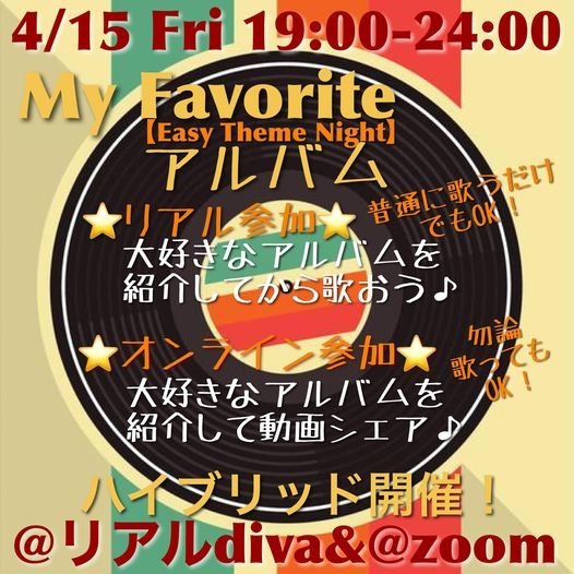 ¡Ø¤³¤Î¥¢¥ë¥Ð¥àÂç¹¥¤¡ª¡Ù¤È¤¤¤Ã¤¿¥¢¥ë¥Ð¥à¡¢Ã¯¤Ç¤â¤¢¤ê¤Þ¤¹¤è¤Í¡©¡ª ¤½¤ó¤Ê¥¢¥ë¥Ð¥à¤«¤éÁª¤ó¤À¶Ê¤ò²Î¤¦¥¤¥Ù¥ó¥È¤Ç¤¹¡£ ²Î¤¦Á°¤Ë°ì¸À¾Ò²ð¤·¤ÆÄº¤¤¤Æ¤«¤é²Î¤Ã¤Æ¤¤¤¿¤À¤¤Þ¤·¤ç¤¦¡ª ¥ª¡¼¥ë¥¿¥¤¥à¡¢¥ª¡¼¥ë¥¸¥ã¥ó¥ëOK¡ª Easy Theme Night¤Î¤ªµ¤·Ú¥¤¥Ù¥ó¥È¡£ ¾Ò²ð¤Ê¤·¤ÇÉáÄ̤˲Τ¦¤À¤±¤Ç¤âOK¤Ç¤¹¡£ ¼Â¤Ï¤³¤Î¥Æ¡¼¥Þ¡¢diva on-line¤Ç¹¥É¾¤À¤Ã¤¿¤Î¤Ç¥ê¥¢¥ë¤Ç¤â¤ä¤Ã¤Æ¤ß¤è¤¦¡ª ¤È¤¤¤¦¤³¤È¤Ç³«ºÅ·èÄꡪ¥ª¥ó¥é¥¤¥ó»²²Ã¤âÊ罸¤·¤Þ¤¹¡ª ¥Ï¥¤¥Ö¥ê¥Ã¥Édiva³«ºÅ¡ª¥ê¥¢¥ë¤â¥ª¥ó¥é¥¤¥ó¤â»²²Ã¼ÔÊç½¸Ãæ¡ª ¡ÚEasy Theme Night¡Û¡Ú¥Ï¥¤¥Ö¥ê¥Ã¥É@¥ê¥¢¥ëdiva