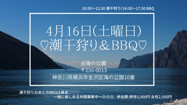 楽しみたい方、参戦して楽しみましょう 4月16日(土) 𓏸𓂂𓈒 潮干狩り&BBQイベント𓈒 𓂂𓏸 男性:5,000円 女性2,500円 10:30〜12:30@海の公園(干潮10:50) 〜〜潮干狩り〜〜 14:30〜17:30@海の公園バーベキュー場/テーブル3 〜〜BBQ場〜〜 あなたのご参加をお待ちしております ******************* *潮干狩りのみの参加は、不可