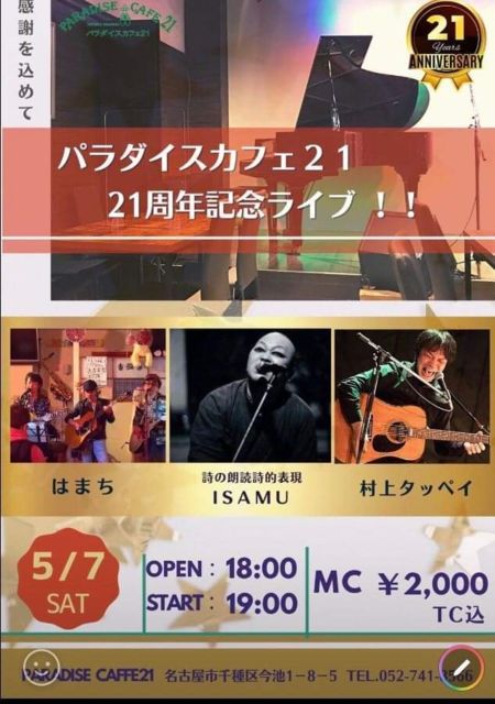 ¥°¥é¥ó¥É¥Ô¥¢¥Î¾ïÀߤΥ饤¥Ö¥Ï¥¦¥¹¡¢º£Ãӡ֥ѥé¥À¥¤¥¹¥«¥Õ¥§21¡×¤Î21¼þǯµÇ°¥é¥¤¥Ö¡£ ¢¢5/7(ÅÚ¢¨Ìë) ÂêÌÜ: ¥Ñ¥é¥À¥¤¥¹¥«¥Õ¥§21 21¼þǯµÇ°¥é¥¤¥Ö ¾ì½ê: º£ÃÓ¡ÖParadise Cafe21¡× http://paradisecafe21.nagoya/ ½»½ê: ̾¸Å²°»ÔÀé¼ï¶èº£ÃÓ°ìÃúÌÜ8-5 º£ÃÓ¥¿¡¼¥ß¥Ê¥ë¥Ó¥ëÃϲ¼°ì³¬ ¸òÄÌ: Ãϲ¼Å´Å컳Àþ¡¦ºùÄÌÀþ¡Öº£ÃÓ ¡×ª«½Ð¸ý¤è¤êÀ¾¤ØÅÌÊâ1ʬ »þ´Ö: 18»þ³«¾ì/19»þ³«±é ÎÁ¶â: 2000±ß¡ÊTC¹þ¢¨°û¿©ÂåÊÌ¡Ë ½Ð±é: ¤Ï¤Þ¤Á ¼¾å¥¿¥Ã¥Ú¥¤ ISAMU