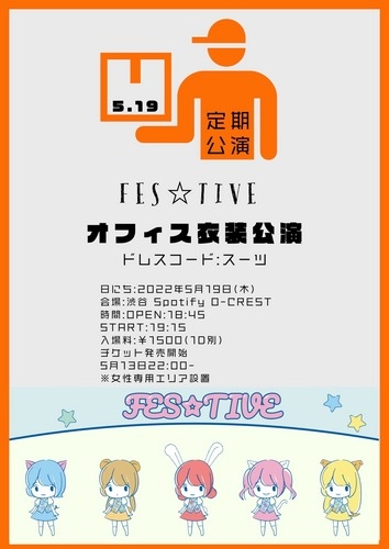 ¡ØFES¡ùTIVEÄê´ü¸ø±é¡Ù -¥ª¥Õ¥£¥¹°áÁõ¸ø±é- ÆüÄø¡§05/19() ³«¾ì18:45 / ³«±é19:00 ²ñ¾ì¡§½ÂëSpotify O-Crest ÎÁ¶â¡§1,500±ß(DÊÌ) ¥Á¥±¥Ã¥È¡§https://tiget.net/events/183049¡¡¢¨5/13,22»þ¡Á ¢¨½÷ÀÀìÍÑ¥¨¥ê¥¢ÀßÃÖ ¢¨¥É¥ì¥¹¥³¡¼¥É¡§¥¹¡¼¥Ä ¡¡¡Ê¥É¥ì¥¹¥³¡¼¥É¤Ïɬ¿Ü¤Ç¤Ï¤´¤¶¤¤¤Þ¤»¤ó¡£¡Ë ¡¡ÅöÆü¥¹¡¼¥Ä¤´ÃåÍѤǤ´Íè¾ì¤ÎÊý¥Ä¡¼¥·¥ç¥Ã¥È¼Ì¥á1Ë祵¡¼¥Ó¥¹¡ª