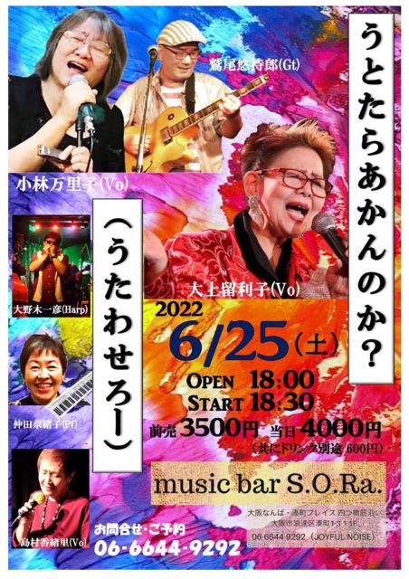 6月25日に難波のS.O.Ra.で 大上留利子さん、シャンソンの島村香緒里さん、 ハモニカの大野木一彦さん、ピアノの仲田奈緒子さんと 一緒にやらせていただきます。 大上一門のソウルフルディーバ、アンディ・チョチョさんに 作成していただいたフライヤーが最高です。 色使い、デザイン、そして大上さん考案のコピーといい、 私の今の心境にこれ以上しっくりくるもんは考えられへんような、 これに尽きると言いますか、 見てるだけで溜飲が下がるような魂のフライヤーに感激しまくりです。 来ていただいたお客さんの溜飲もバッチリ下がるような