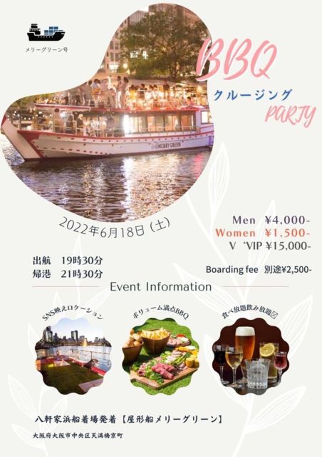 風通しの良い芝生の上で楽しめる2階建てのグランピング船「メリーグリーン」貸切 ⛴お寿司、黒毛和牛、スイーツあり ※参加希望の方は、参加人数と参加される方の代表者様のお名前をメッセください 《日時》 2022/6/18(土) 出航:19時30分 帰港:21時30分 《開催場所》 八軒家浜船着場発着『屋形船メリーグリーン』 https://merrygreen.jp/ 大阪府大阪市中央区天満橋京町 京阪電車「天満橋駅」下車すぐ(10秒) 大阪市営地下鉄谷町線「天満橋駅」下車すぐ