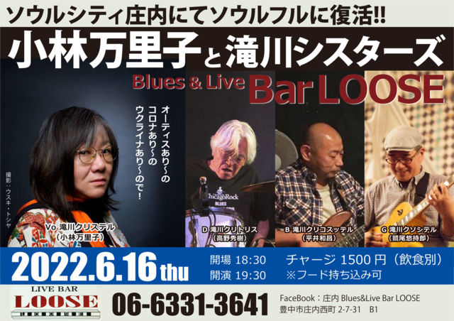 5年ぶりに「滝川シスターズ」でやらせていただきます。 コ〇ナとかいろいろな事情で休止状態だったのですが、 遂に遂に6月16日より活動再開です。 オーティス・レディング好きがよってこってやらせて いただいてるバンドでして、メンバー紹介の曲は オーティスの「I can't turn you loose」に歌詞を 付けた「滝川クリステルのテーマ」からの発展形である 「滝川シスターズのテーマ」であります。 オーティスナンバーがバンドでやれたらええなあ、と 45年前から願望してきて、ものすごくスローではありましたが 「引き寄せの法則」が働き、最