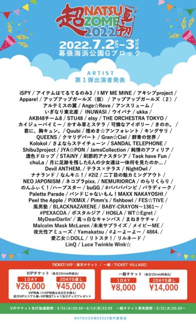 ¡ÖĶNATSUZOME 2022¡×https://natsuzome.info/ ÆüÄø¡§07/02(ÅÚ)¡Á03(Æü) ²ñ¾ì¡§ËëÄ¥³¤É͸ø±àG¥Ö¥í¥Ã¥¯ ÎÁ¶â¡§1DayVIP 26,000±ß / 2DaysVIP 45,000±ß / 1Day 8,000±ß / 2Days 14,000±ß ¥Á¥±¥Ã¥È¡§https://ticketvillage.jp/events/11659 ¢£🎫¡§ËÜÆü20:30¤è¤ê¥Á¥±¥Ã¥ÈÈÎÇ䳫»Ï🔥 ✨VIP¸ÂÄêÃêÁª https://ticket.rakuten.co.jp/music/jpop/idle/RTPYTNZ/ ✨°ìÈÌÀèÃå https://ticketvillage.jp/events/11659