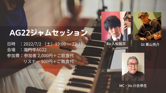 7·î2Æü¡ÊÅڡˤÎÈդ˹â±ß»û¤Î¥é¥¤¥Ö¥Ð¡¼¡ÖAG 22¡×¤Ë¤Æ¡¢¥¸¥ã¥º/¥Ü¥µ¥Î¥Ð/¥Ý¥Ã¥×¥¹¤òÃæ¿´¤È¤·¤¿¥¸¥ã¥à¥»¥Ã¥·¥ç¥ó¤ò³«ºÅ¤·¤Þ¤¹¡£¥Ü¡¼¥ê¥¹¥È¡¢³Ú´ï¥×¥ì¥¤¥ä¡¼¤Ï¤â¤Á¤í¤ó¤Î»ö¡¢¥é¥Ã¥Ñ¡¼¡¢¥À¥ó¥µ¡¼¡¢¤½¤Î¾¥Ñ¥Õ¥©¡¼¥Þ¡¼¤ÎÊý¤âÀ§Èóʳ¤Ã¤Æ¤´»²²Ã²¼¤µ¤¤¡£²Î¤Ã¤¿¤ê¡¢±éÁդϤ·¤Ê¤¤¤±¤É¡¢°û¤ß¤Ê¤¬¤é±éÁÕ¤òݤ¤¤Æ¤ß¤¿¤¤¤È¤¤¤¦¥ê¥¹¥Ê¡¼¤ÎÊý¤âÂç´¿·Þ¤Ç¤¹¡£ ¡¦²ñ¾ì¡§AG22 ¿ùʶè¹â±ß»ûÆî£´ÃúÌÜ£²£¶¡Ý£±£µ¡¡ ÉٻΥӥë5³¬ ¢¨JR¹â±ß»û±ØÆî¸ýÅÌÊâ2ʬ ÃϿޡ§https://goo.gl/maps/XYPHW4guqRjnrCvJ7 ¡¦¥Û¥¹¥È ÆþÁ¥Íµ¼¡¡ÊWb¡Ë ·ª»³Î¼²ð¡ÊGt¡Ë Àî¹ç¶³À¸¡ÊMC¡¦Vo¡Ë