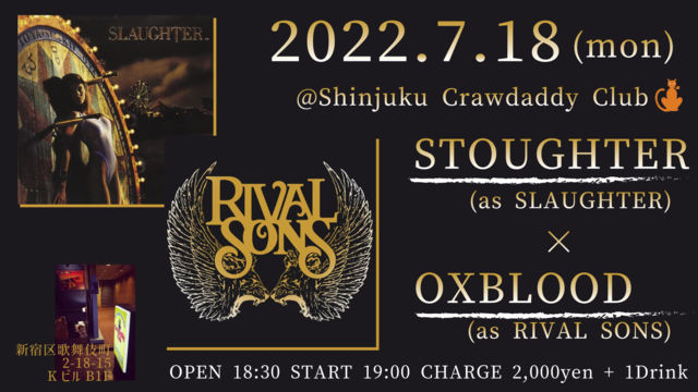 7/18 本日のライブ STOUGHTER(as SLAUGHTER) & Oxblood(as Rival Sons) Live OPEN 18:30 START 19:00 CHARGE 2000円 よろしくお願いいたします!