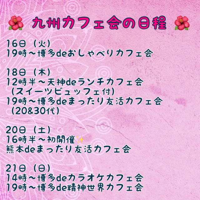 ○●○熊本の友達作り!@九州カフェ会●○● 熊本の皆さん、はじめまして! 九州カフェ会と申します。 初めて『熊本deまったり友活カフェ会』を開催します♪ 九州カフェ会とは…?! その時に出会ったメンバーで 会話を楽しむ少人数の交流会です! 自己紹介から始まり話す内容は自由です。 まったりおしゃべりを楽しむも良し 氣になっているテーマを持ち込むも良し 他の方の話を聞いて楽しむも良しですよ〜(*´﹀`*) 少人数なので、参加者同士が氣軽に話しやすく 打ち解けるのも早いです! 少人数だからこそ出来る
