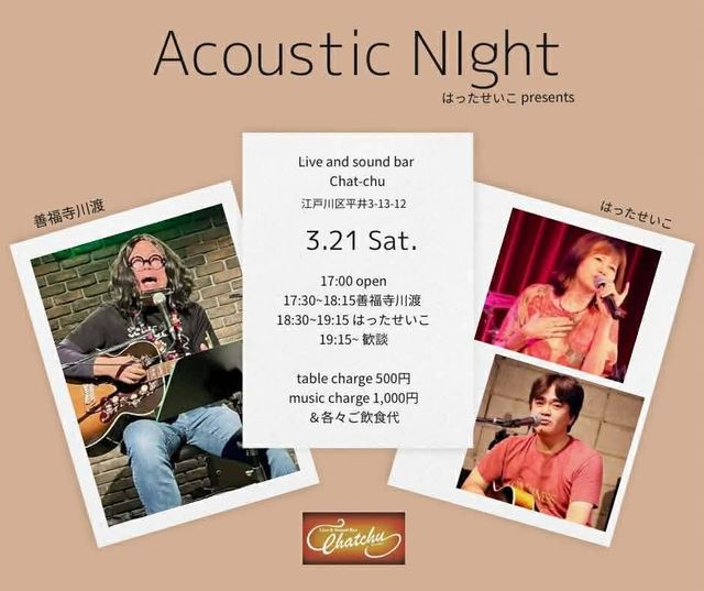 ¤Ï¤Ã¤¿¤»¤¤¤³¡Ê¾¾ÅÄÀ»»Ò¥¢¥³¥«¥Ð¡¼¡Ëpresents-Acoustic Night Vol.2³«ºÅ¤Î¤ªÃΤ餻¤Ç¤¹¡£ ºòǯ9·î¤Î½é²ó¤ÏÂçÀ¹¶·ËþÀʸæÎé¤È¤Ê¤ê¤Þ¤·¤¿¤Î¤Ç¡¢¤ª±Û¤·Äº¤±¤Ê¤«¤Ã¤¿¤ªµÒÍͤÏɬİɬ¸«¡ª¤è¤í¤·¤¯¤ª´ê¤¤¤¤¤¿¤·¤Þ¤¹¡£ ŹÆâ¥­¥ã¥Ñ¥·¥Æ¥£¤ÎÅÔ¹ç¤Ë¤è¤ê15̾ÍͤÎÀèÃ头ͽÌóÍ¥Àè¤È¤µ¤»¤ÆÄº¤¤¤Æ¤ª¤ê¤Þ¤¹¡£ ¤´ÅÔ¹ç¤Ä¤­¤Þ¤·¤¿¤é½Ð±é¼Ô¤µ¤Þ¡¢¤Þ¤¿¤Ï¥Á¥ã¥Ã¥Á¥åŹ¼ç¡¦µÈ¼¤Þ¤Ç¥á¥Ã¥»¡¼¥¸Åù¤Ç¤´Í½Ìó¤ò¤ª´ê¤¤¤¤¤¿¤·¤Þ¤¹m(__)m ¡ú¤Ï¤Ã¤¿¤»¤¤¤³Presents Acoustic Night Vol.£² ¡ú2026ǯ£³·î£²£±Æü¡ÊÅÚ¡Ë 17:00_open¡¡ 17:30_start ¡¦17:30¡Á18:15 Á±Ê¡»ûÀî