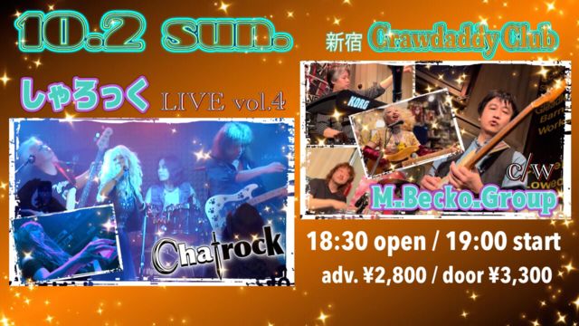10/2 ËÜÆü¤Î¥é¥¤¥Ö¡¡ ¡ØCha+rock¡Á¤·¤ã¤í¤Ã¤¯¡Á¡Ù¡õ ¡ØM.Becko Group ¡ÙLIVE¡¡ OPEN 18:30 START 19:00 charge adv\2800/Door\3300¡¡ ¤è¤í¤·¤¯¤ª´ê¤¤¤¤¤¿¤·¤Þ¤¹¡ª¡ª