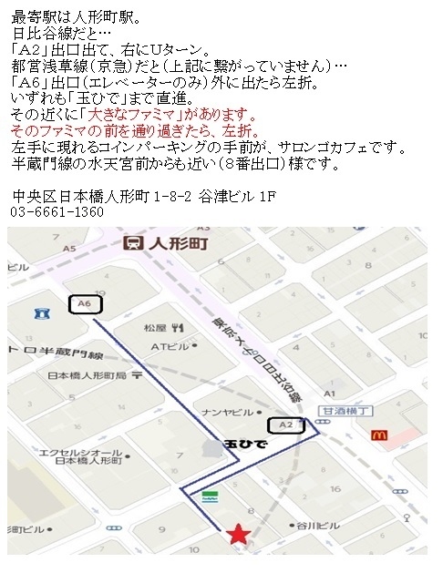 ¡ü³µÍ× £²·î£²£¶Æü¡ÊÆü¡Ë ¿Í·ÁÄ®¡§¥µ¥í¥ó¥´¥«¥Õ¥§ http://www.cafe-salongo.com/ ²¬ËܼçǤ¤È²¶¤Î½÷¤¿¤Á ¡Á40¿ÍÌܤϡÄnari¡Ê¤Ê¤ê¡Ë 17:00/18:00 ͽÌó1500 ÅöÆü2000 (+޵ްŽÀŽÞް) ¡¡¡¡ ¡ü¥¿¥¤¥à¥¹¥±¥¸¥å¡¼¥ë 18:00¡¡²¬ËܼçǤ 18:30¡¡nari 18:55¡¡µÙ·Æ 19:05¡¡nari 19:35¡¡²¬ËܼçǤ 20:00¡¡Ž±ŽÝŽºŽ°ŽÙ޾ޝ޼ޮŽÝ 20:15¡¡½ª±é 21:00¡¡ÊÄŹ ¡¡ ¡ü¥¢¥¯¥»¥¹ ºÇ´ó±Ø¤Ï¿Í·ÁÄ®±Ø¡£ ÆüÈæÃ«Àþ¤À¤È¡¢¡Ö£Á£²¡×½Ð¸ý¤ò½Ð¤Æ¡¢±¦¤Ë£Õ¥¿¡¼¥ó¡£ ÅÔ±ÄÀõÁðÀþ¡ÊµþµÞ¡Ë¤À¤È¡Ê£Á£²¤Ë·Ò¤¬¤Ã¤Æ¤Þ¤»¤ó¡Ë¡Ö£Á£¶¡×½Ð¸ý¡Ê¥¨¥ì¥Ù¡¼¥¿¡¼¤Î¤ß¡Ë½Ð¤Æº¸ÀÞ¡£¤·¤Ð¤é¤¯